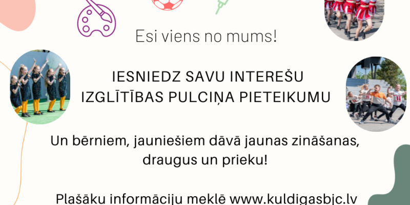 Kuldīgas novada pašvaldība izsludina pieteikšanos uz valsts finansējumu interešu izglītības programmu realizēšanai no 2023. gada 1. septembra līdz 2024. gada 31. maijam.