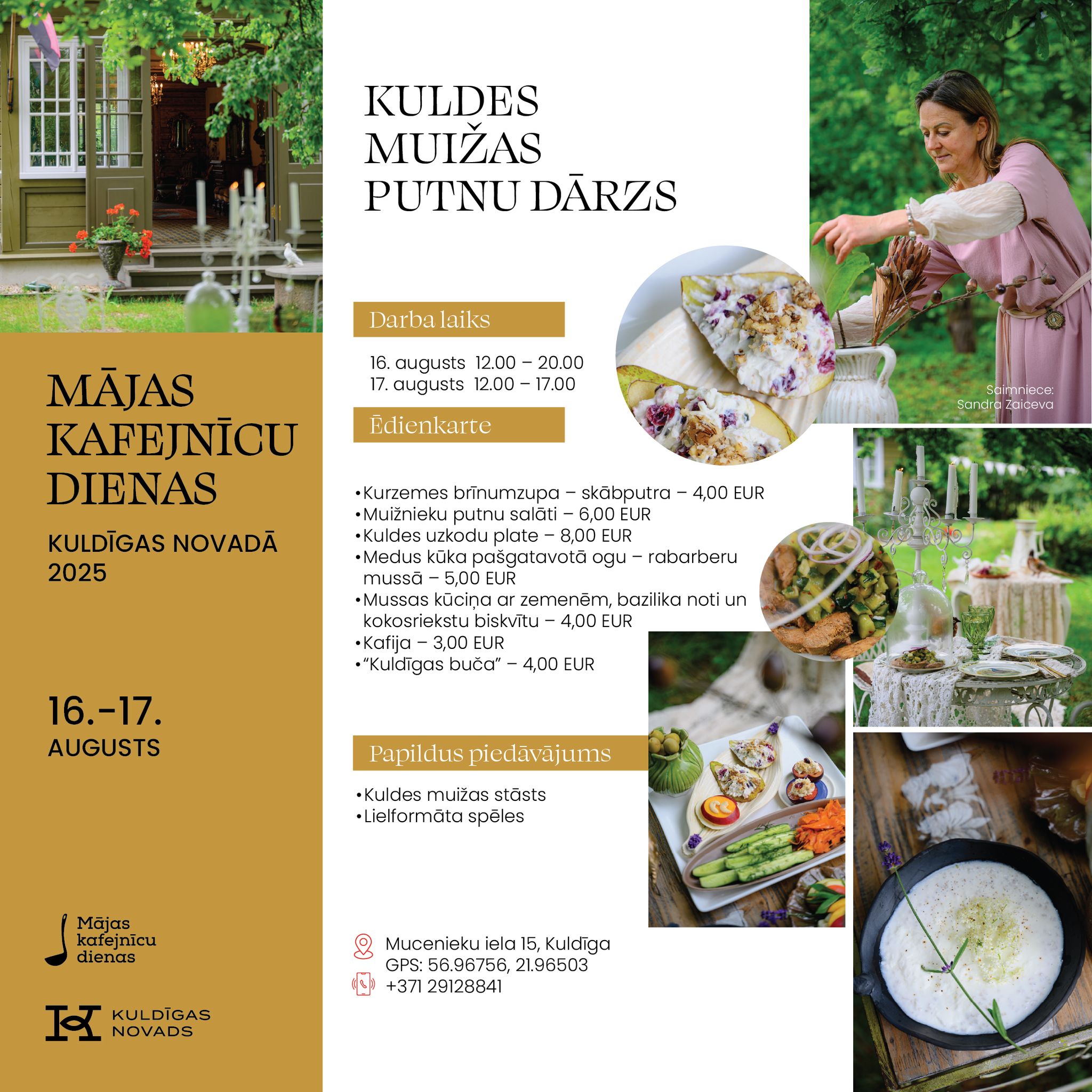 Informācija, ēdienkartes un kontakti pieejami www.majaskafejnicas.lv un https://www.facebook.com/search/top?q=visit%20kuldiga