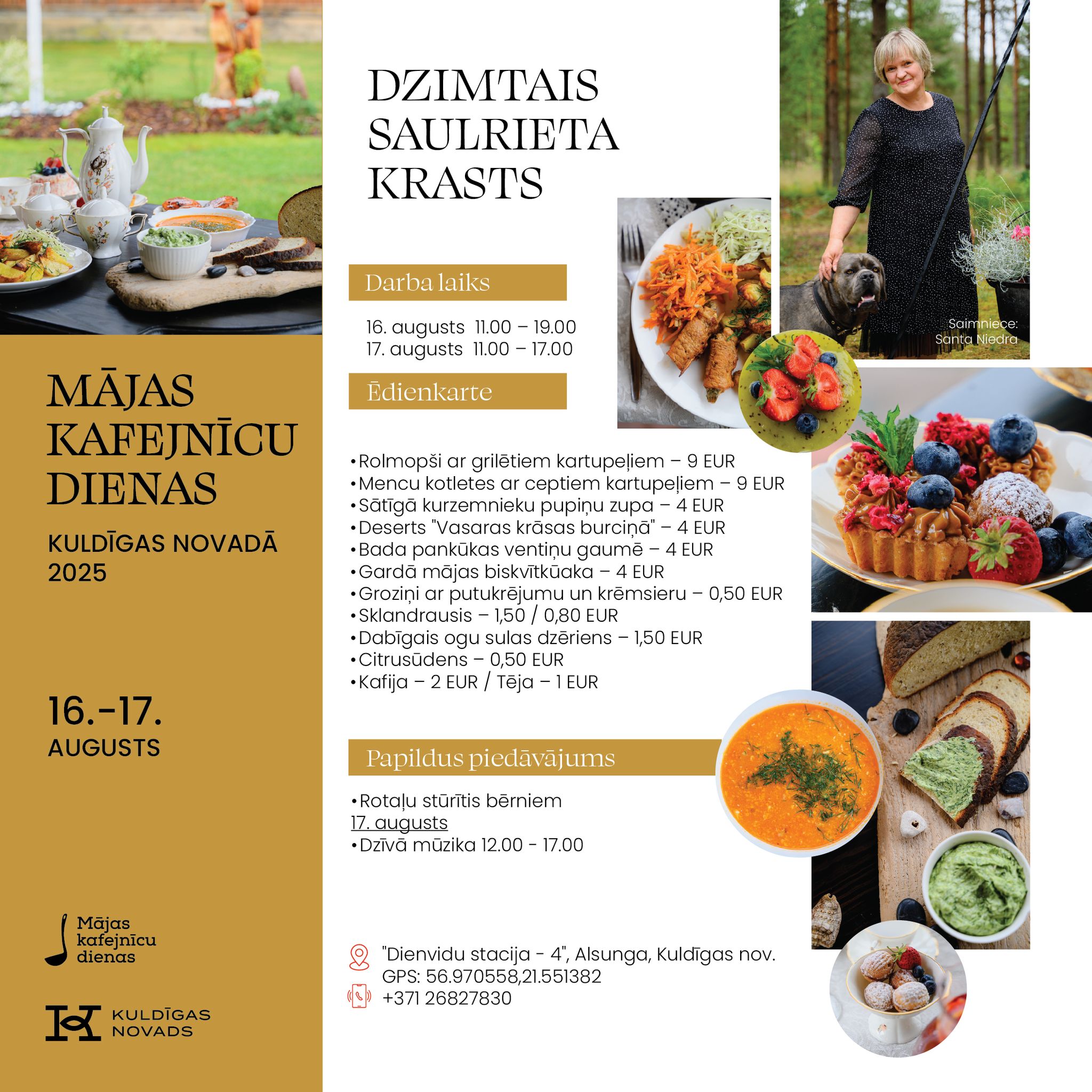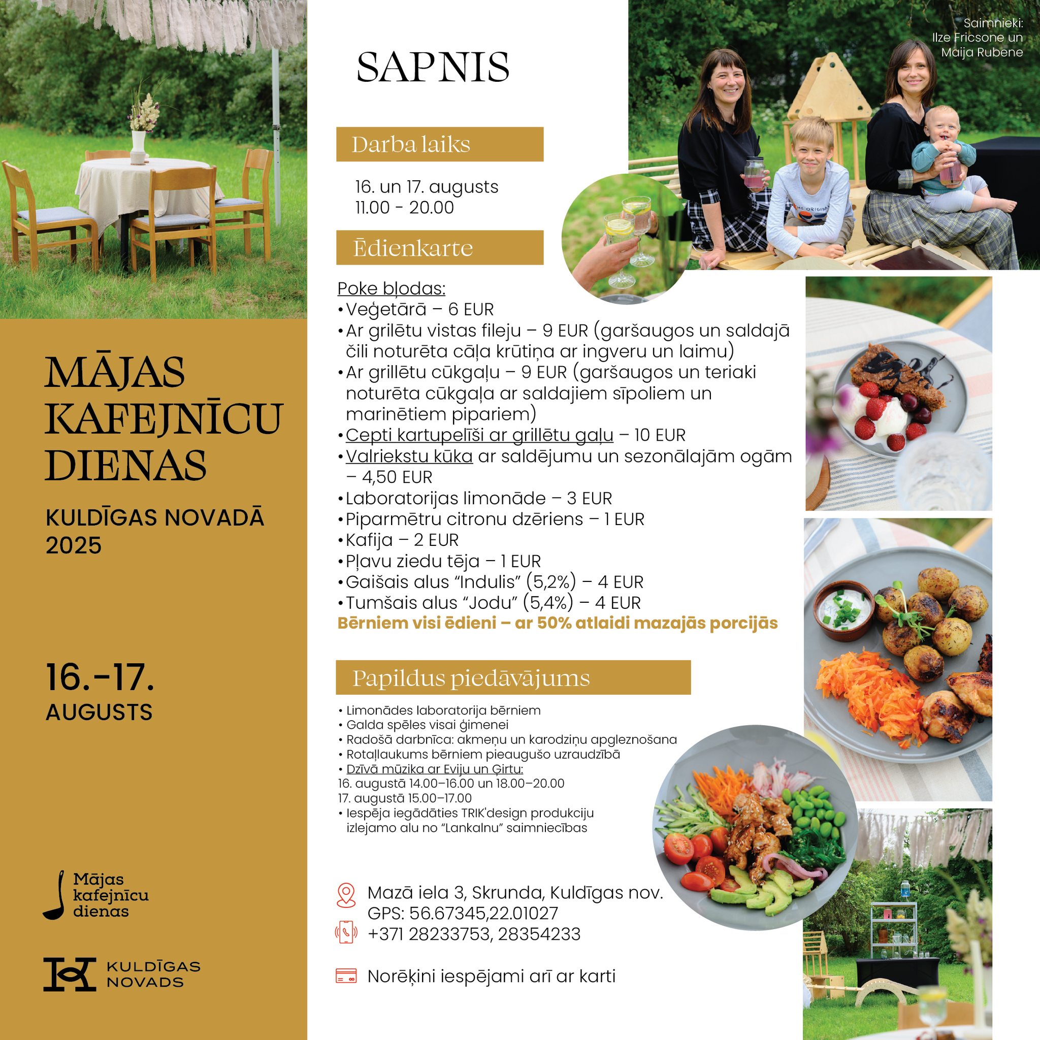 Vietējie saimnieki un saimnieces atvērs savu māju durvis, pagalmus un dārzus, pārvēršot tos par mājas kafejnīcām ar īpašu atmosfēru un gardiem ēdieniem. Kuldīgas novadā viesus gaidīs 11 kafejnīcas: “Trīsuļi’’, “Kuldes muižas Putnu dārzs’’, “Karnevāls Silniekos’’, “Vizbuļi’’, “Sapnis’’, “Bangotnes’’, “Ciemos pie Baltiņu saimes’’, “Skuju bode’’, “Spanga’’, “Dzimtais saulrieta krasts’’ un “Dārza svētki pie Burkas kundzes’’.