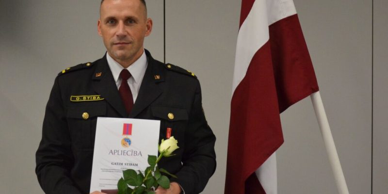 Valsts ugunsdzēsības un glābšanas dienesta Skrundas posteņa vada komandiera vietnieks Gatis Stiba saņem apbalvojuma par ieguldījumu starptautiskajā palīdzībā