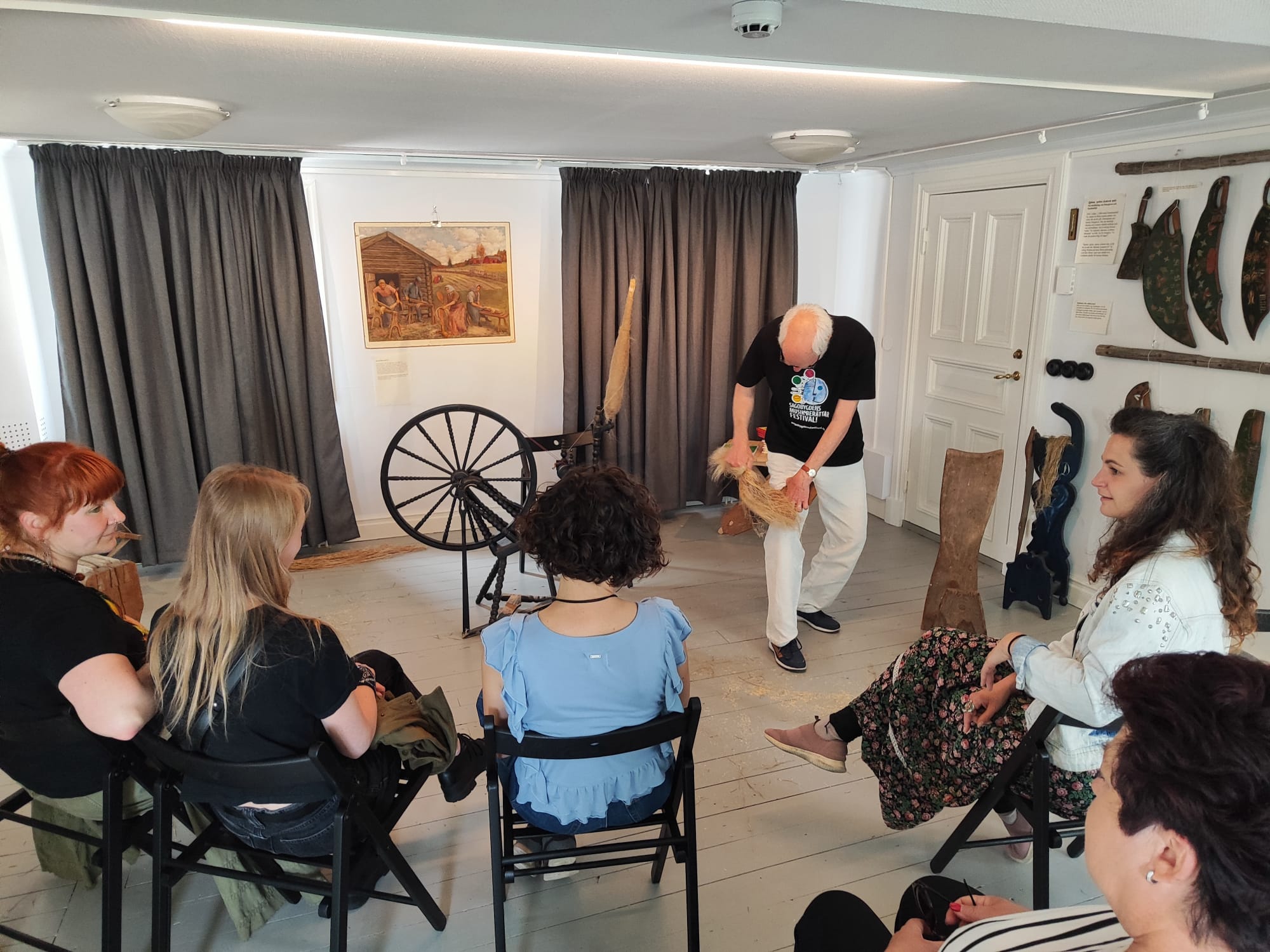 Paralēli festivāla notikumiem organizācijas vadītāja Tīne Vintere iepazīstināja ar Stāstniecības muzeju, kas bija festivāla epicentrā, kā arī ar Jungbī pilsētas nemateriālā kultūras mantojuma izpausmēm pilsētvidē – bērnu rotaļlaukumu, kas izveidots pēc mītiska pasaku tēla motīviem, un sienu gleznojumiem pilsētā, kas vēsta par stāstniecības tradīcijām. Devāmies izbraukumā ārpus pilsētas, apmeklējot stāstu maršrutu, kas izvietots trīs pašvaldību robežās un ar atraktīvām “pieturzīmēm” – īpašiem stāstu skapīšiem – vēsta par vietējām teikām un leģendām.