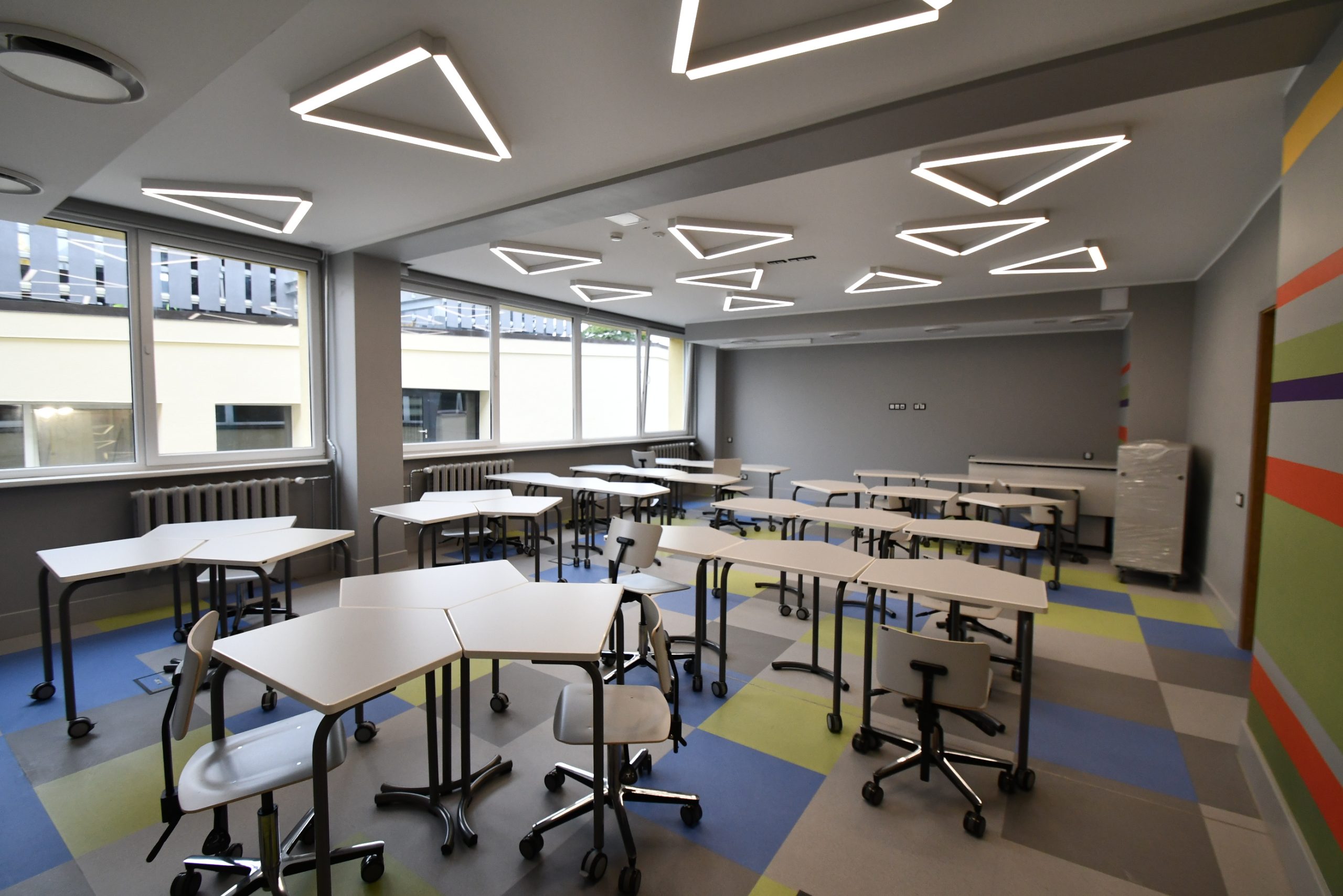Kuldīgas Centra vidusskola lepojas ne tikai ar skaistu interjeru, bet arī jaunu aprīkojumu – 50 datoriem un 25 planšetēm, ekrāniem stundu sarakstiem un paziņojumiem, TV un interaktīvām tāfelēm, kā arī modernām un ergonomiskām mēbelēm – krēsliem, galdiem, mobiliem plauktiem, kas piemēroti mācību materiālu uzglabāšanai.
